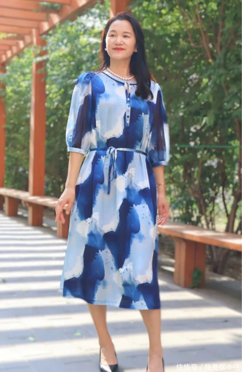 当作夏天最受中年女性迎接的裙装,若是想要穿出阴凉又文静的效用,那么就可以选择冷色调,比如蓝色、绿色、青色就很可以,选装尽量自带收腰规划,或者是愚弄腰带进行勾画,更故意于分割黄金比例;宽松的裙摆和浅口鞋还能造成“宽窄对比”的效用,若是过膝裙融入了文静图案的话,鞋子就要选纯色。