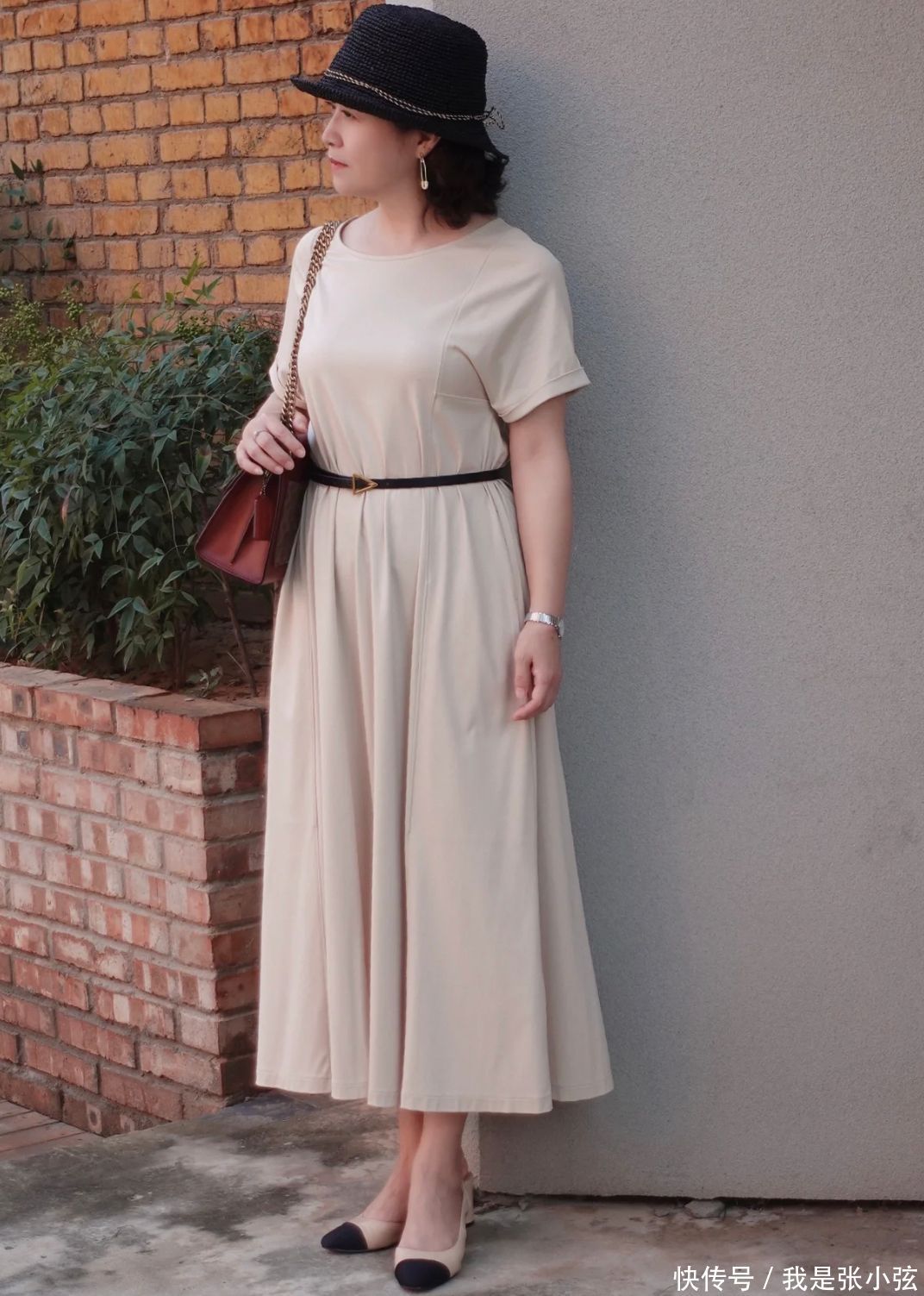 过膝裙穿搭示范——收腰连衣裙+浅口鞋
