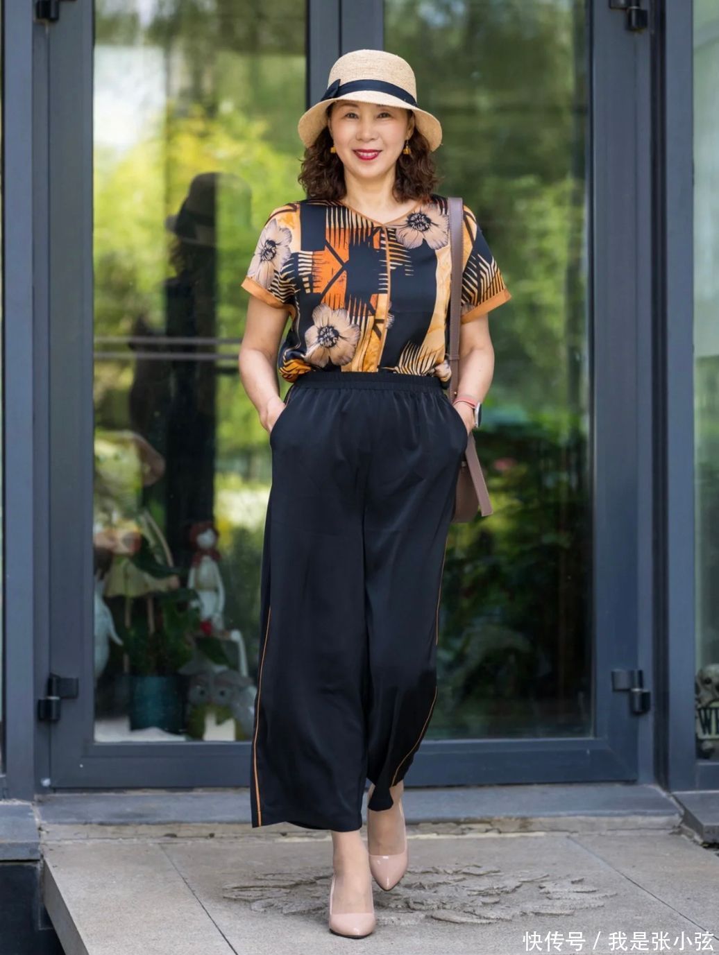 九分裤穿搭示范——印花T恤+阔腿九分裤