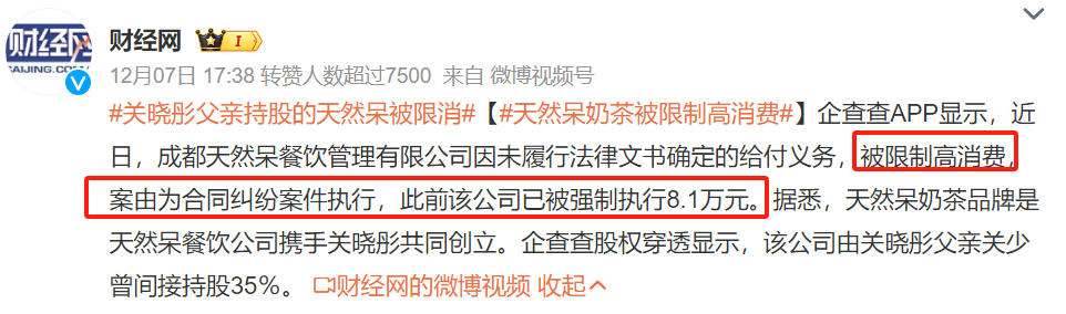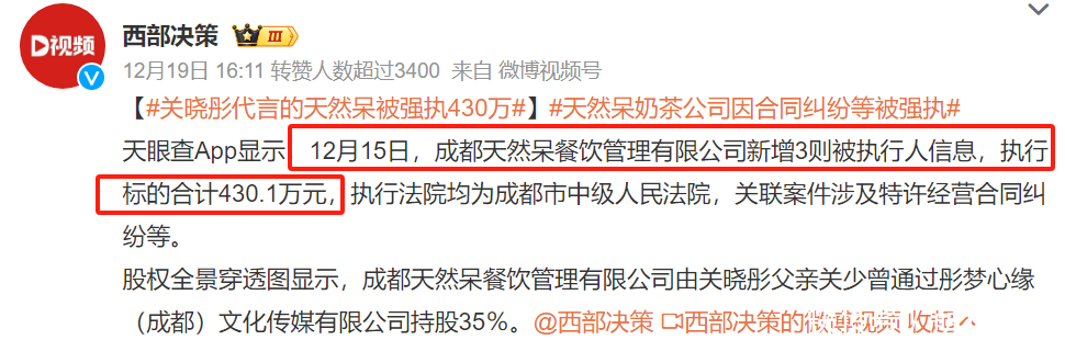 近日,关晓彤爸爸握股的奶茶店“自然呆”,先是被曝因左券纠纷案件被适度高浮滥。随后又被强制奉行430万。据媒体爆料,关晓彤的爸爸关少曾在这家公司蜿蜒握股35%。关晓彤曾经是自然呆的代言东谈主。