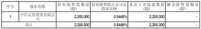 本次上市理解的限售股为公司初度公配置行保荐机构中信证券股份有限公司的子公司中信证券投资有限公司所抓计谋配售限售股份,股份数目为2,200,000股,占公司最新总股本数的比例为0.5448%,限售期为初度公配置行股份上市之日起24个月,将于2023年6月26日废除限售并上市理解(因2023年6月23日为非往改日,故顺延至下一往改日)。